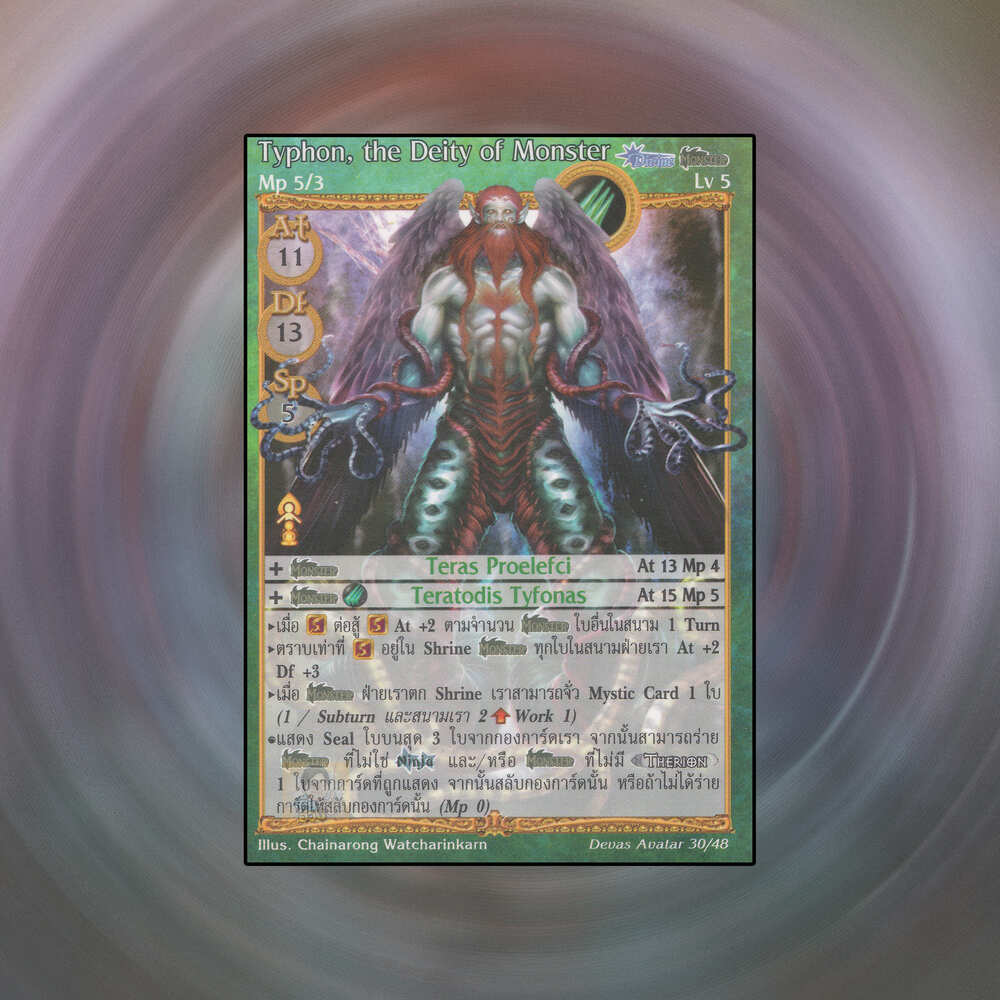 เป็นการ์ดเกม Summoner Master OG ในชุด Devas Avatar นี้จะมีการ์ดทั้งหมด 48 แบบ Typhon, the Deity of Monster เป็น Seal Card ธาตุลม เผ่าพันธุ์อสูรศักดิ์สิทธิ์ หมายเลข 30: ระดับการค้นหาเป็นการ์ดพิเศษ