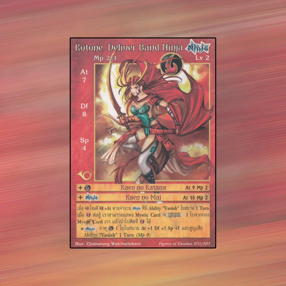 เป็นการ์ดเกม Summoner Master OG ในชุด Hymn of Exodus นี้จะมีการ์ดทั้งหมด 108 แบบ Kotone, Deliver Band Ninja เป็น Seal Card ธาตุไฟ เผ่าพันธุ์นินจา หมายเลข 31 ระดับการค้นหาเป็นการ์ดหายาก