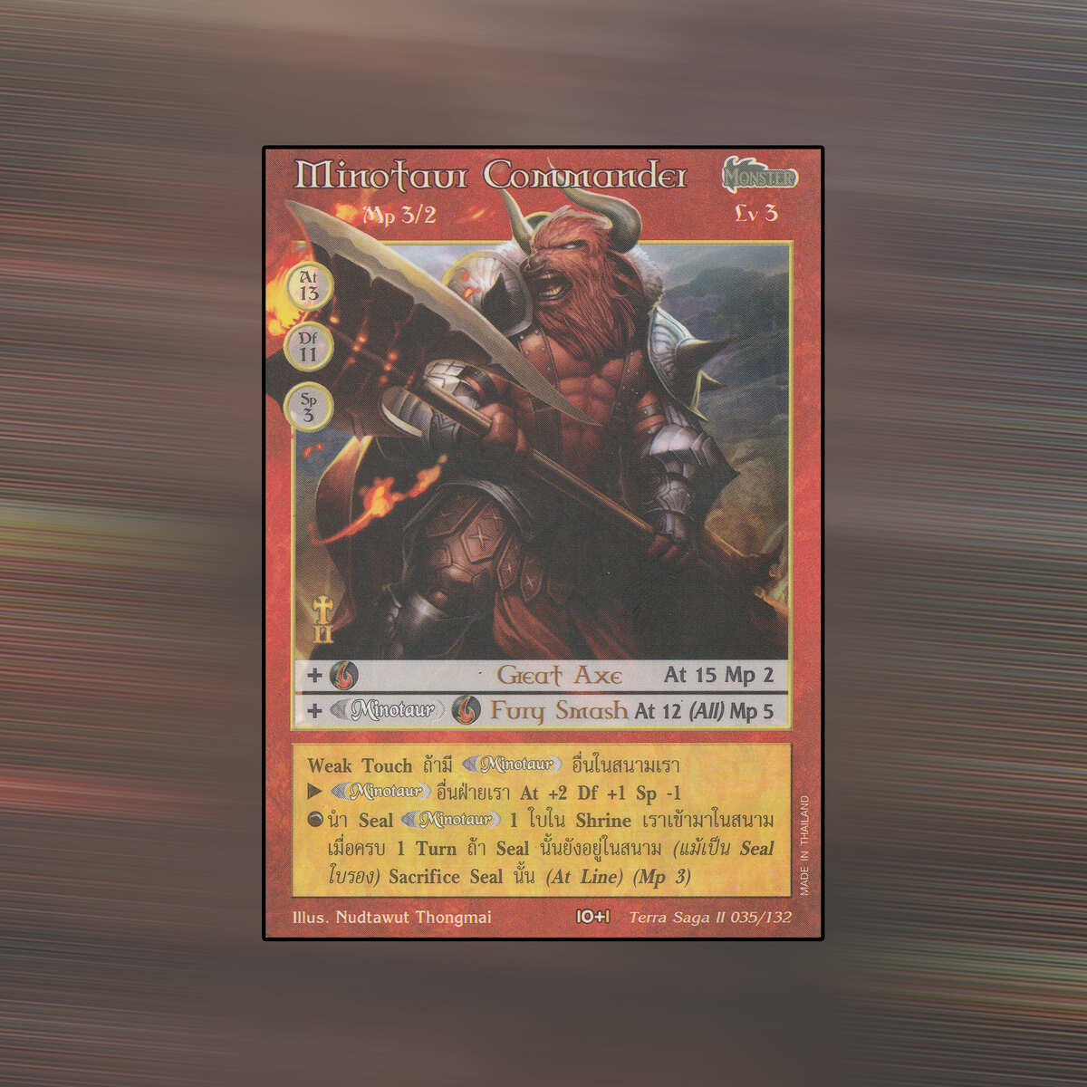 เป็นการ์ดเกม Summoner Master OG ในชุด Terra Saga II นี้จะมีการ์ดทั้งหมด 132 แบบ Minotaur Commander เป็น Seal Card ธาตุ Fire เผ่าพันธุ์ Monster หมายเลข 35 ระดับการค้นหา Rare