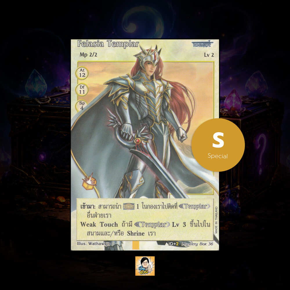 เป็นการ์ดเกม “Summoner Master OG” ในชุด “Mystery Box” นี้จะมีการ์ดทั้งหมด 131 แบบ “Felasia Templar” เป็น Seal Card ธาตุ Light ประเภท Knight หมายเลข 36 ระดับการค้นหา Special