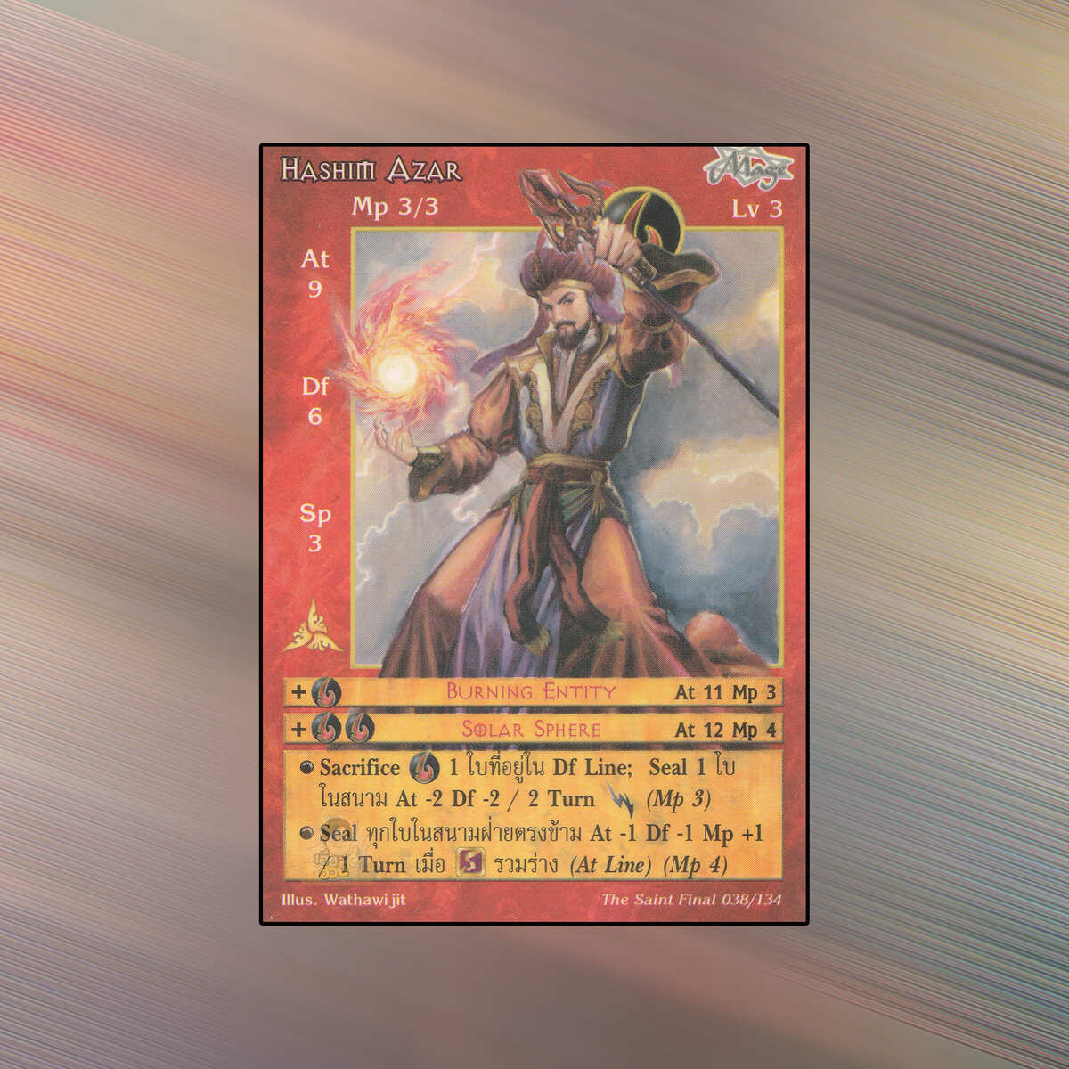 เป็นการ์ดเกม Summoner Master OG ในชุด The Saint Final นี้จะมีการ์ดทั้งหมด 135 แบบ Hashim Azar เป็น Seal Card ธาตุ Fire เผ่าพันธุ์ Mage หมายเลข 38 ระดับการค้นหา Rare