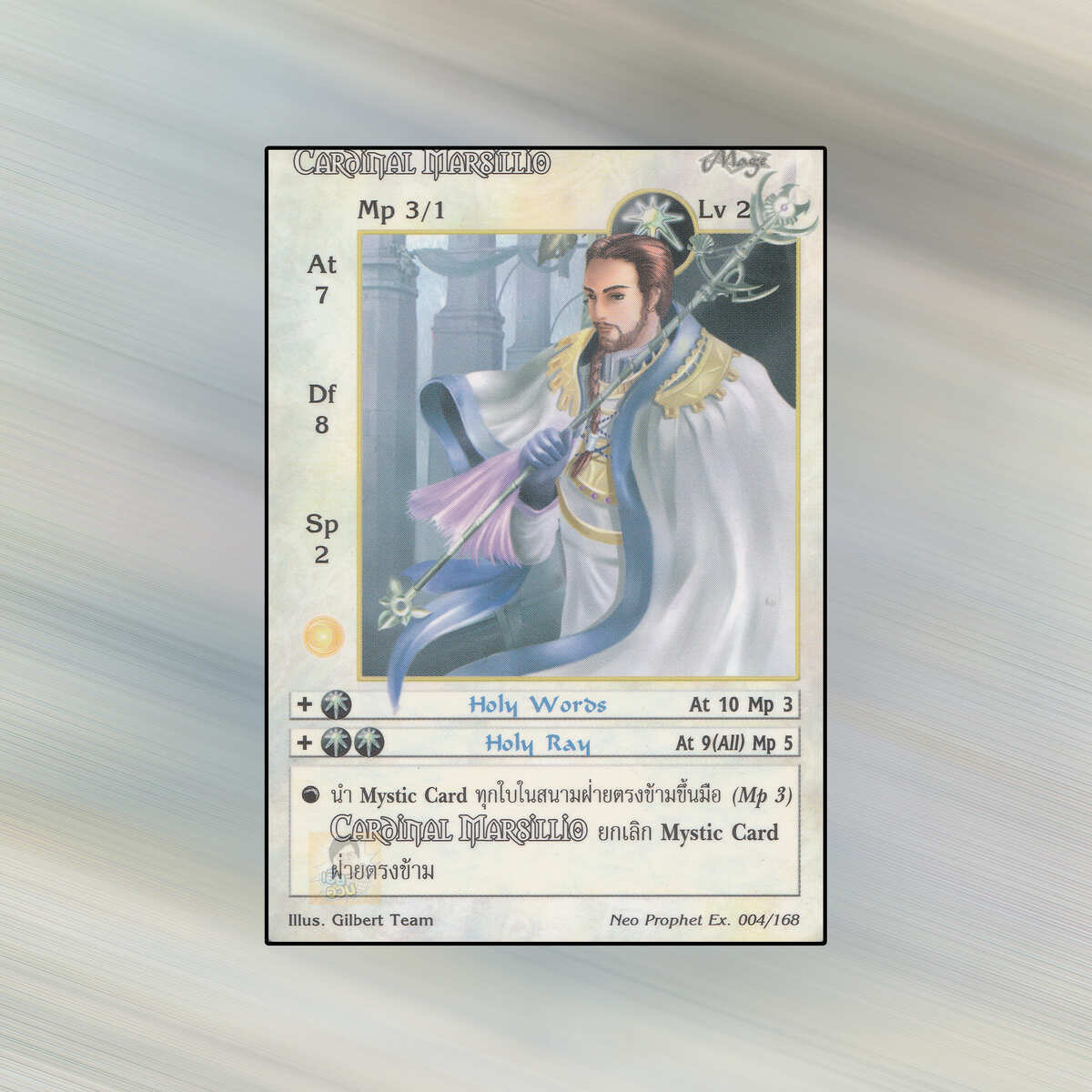 เป็นการ์ดเกม Summoner Master OG ในชุด Neo Prophet Extended นี้จะมีการ์ดทั้งหมด 169 แบบ “Cardinal Marsillio” เป็น Seal Card ธาตุ Light เผ่าพันธุ์ Mage หมายเลข 4 ระดับการค้นหา Rare
