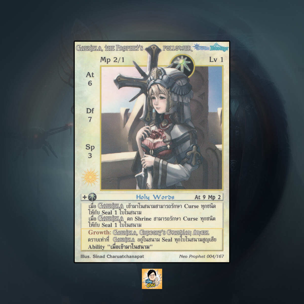 เป็นการ์ดเกม Summoner Master OG ในชุด Neo Prophet นี้จะมีการ์ดทั้งหมด 168 แบบ “Gabriela, the Prophet’s follower” เป็น Seal Card ธาตุ Light เผ่าพันธุ์ Divine Messenger หมายเลข 4 ระดับการค้นหา Rare