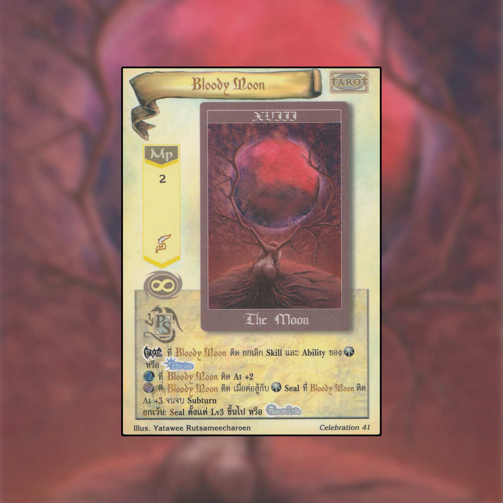 เป็นการ์ดเกม Summoner Master OG ในชุด Celebration นี้จะมีการ์ดทั้งหมด 235 ใบ Bloody Moon เป็น Mystic Card ประเภทไพ่ทาโรต์ หมายเลข 41: ระดับการค้นหาเป็นการ์ดโปรโมชัน