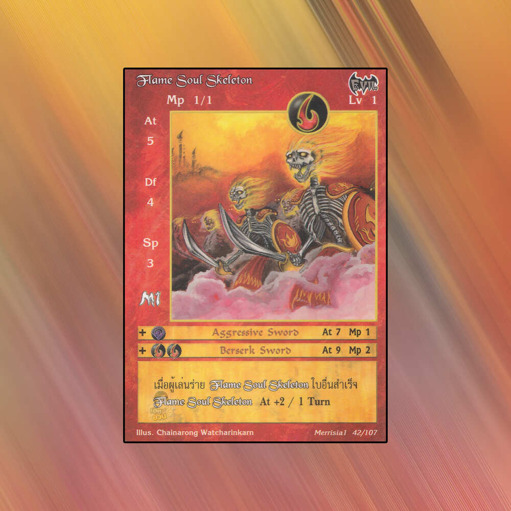 เป็นการ์ดเกม Summoner Master OG ในชุด Merrisia 1st Impression นี้จะมีการ์ดทั้งหมด 108 แบบ Flame Soul Skeleton เป็น Seal Card ธาตุไฟ เผ่าปีศาจ หมายเลข 42: ระดับการค้นหาเป็นการ์ดทั่วไป