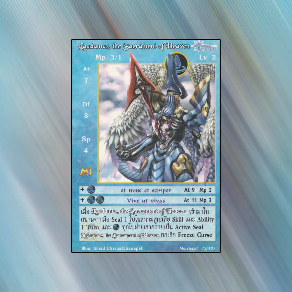 เป็นการ์ดเกม Summoner Master OG ในชุด Merrisia 1st Impression นี้จะมีการ์ดทั้งหมด 108 แบบ Laudamus, the Sacrament of Heaven เป็น Seal Card ธาตุน้ำ เผ่าเทพเจ้า หมายเลข 43: ระดับการค้นหาเป็นการ์ดหายาก