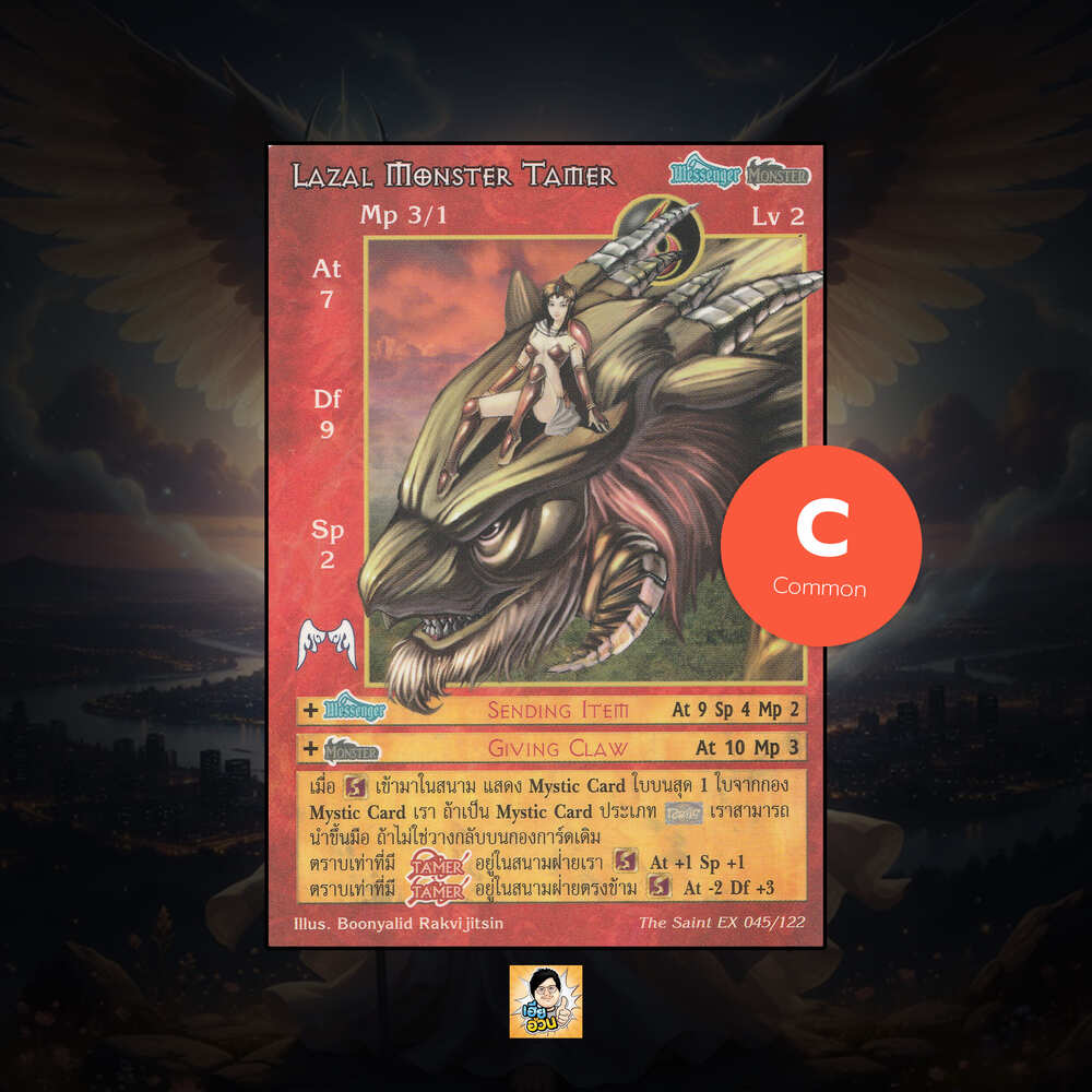 เป็นการ์ดเกม “Summoner Master OG” ในชุด “The Saint EX” นี้จะมีการ์ดทั้งหมด 123 แบบ “Lazal Monster Tamer” เป็น Seal Card ธาตุ Fire เผ่าพันธุ์ Messenger Monster หมายเลข 45 ระดับการค้นหา Common