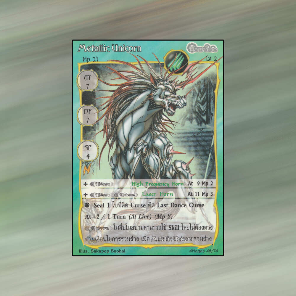 เป็นการ์ดเกม Summoner Master OG ในชุด 4 Nagas นี้จะมีการ์ดทั้งหมด 75 แบบ “Metallic Unicorn” เป็น Seal Card ธาตุลม เผ่าเครื่องจักรกล หมายเลข 48: ระดับการค้นหาเป็นการ์ดพิเศษ