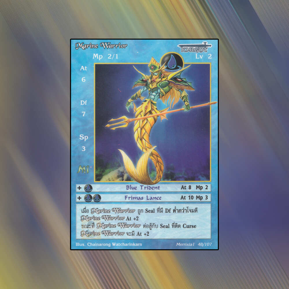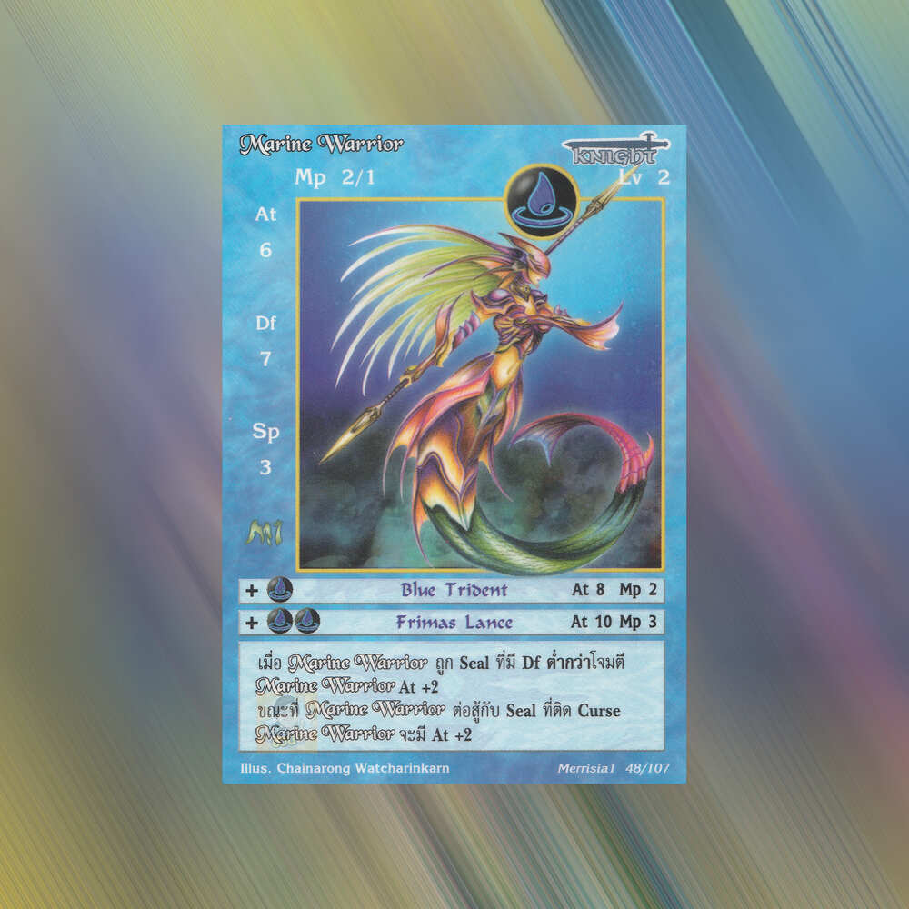 เป็นการ์ดเกม Summoner Master OG ในชุด Merrisia 1st Impression นี้จะมีการ์ดทั้งหมด 108 แบบ Marine Warrior เป็น Seal Card ธาตุไฟ เผ่าอัศวิน หมายเลข 48: ระดับการค้นหาเป็นการ์ดทั่วไป