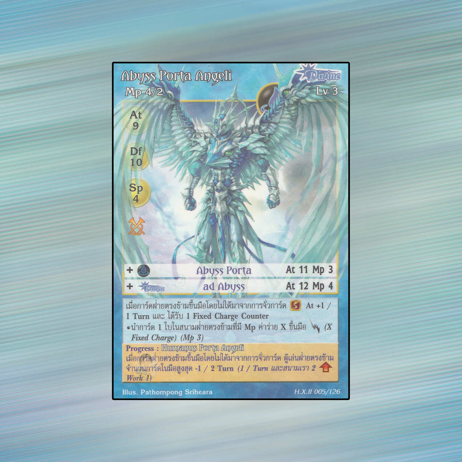 เป็นการ์ดเกม Summoner Master OG ในชุด Hymn of Exodus II นี้จะมีการ์ดทั้งหมด 138 แบบ Abyss Porta Angeli เป็น Seal Card ธาตุน้ำ เผ่าพันธุ์เทพเจ้า หมายเลข 5 ระดับการค้นหาเป็นการ์ดหายาก