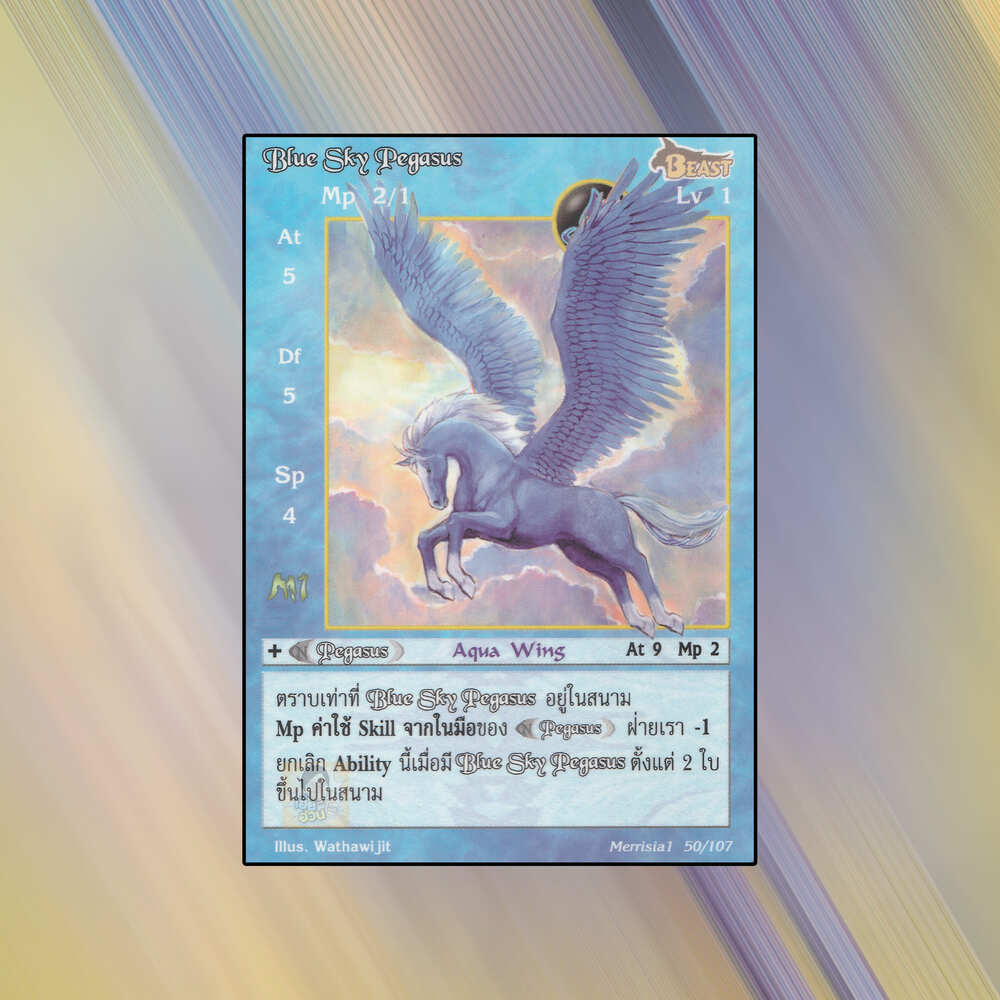 Blue Sky Pegasus เป็นการ์ดเกม Summoner Master OG ชุด Merrisia 1st  เป็น Seal Cards หมายเลข 50 เลเวล 1 ธาตุน้ำ เผ่าสัตว์เดรัจฉาน: ระดับการค้นหาเป็นการ์ดทั่วไป