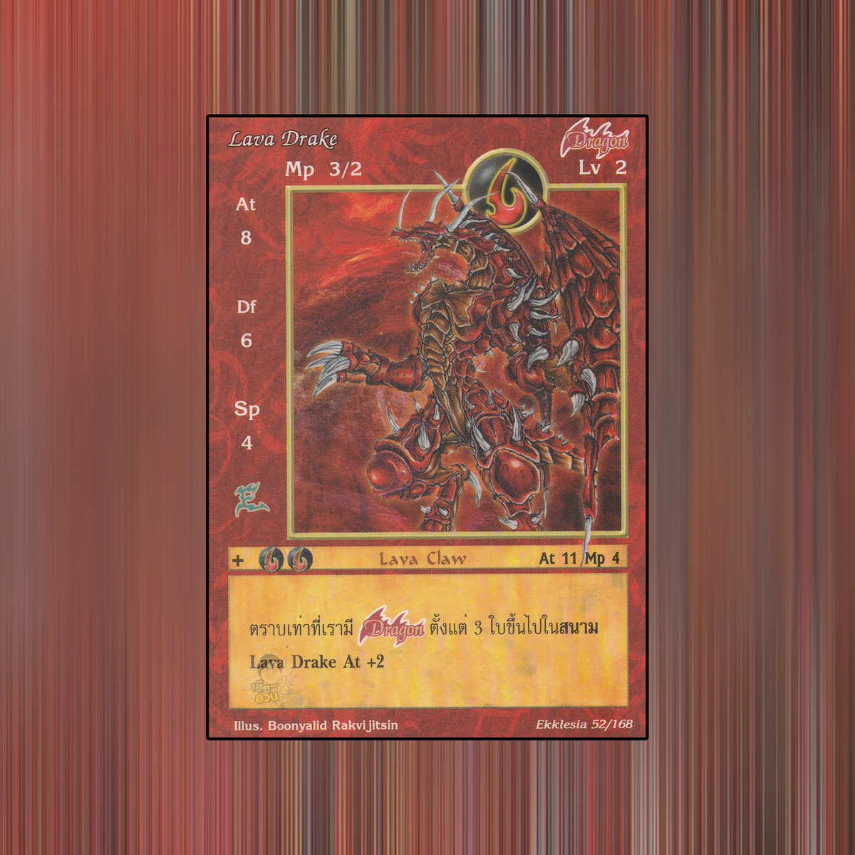 เป็นการ์ดเกม Summoner Master OG ในชุด Ekklesia นี้จะมีการ์ดทั้งหมด 168 แบบ Lava Drake เป็น Seal Card ธาตุ Fire เผ่าพันธุ์ Dragon หมายเลข 52 ระดับการค้นหา Uncommon