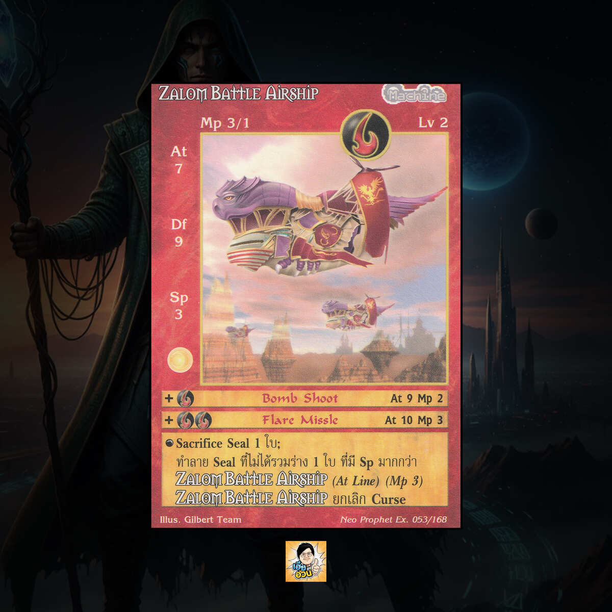 เป็นการ์ดเกม Summoner Master OG ในชุด Neo Prophet Extended นี้จะมีการ์ดทั้งหมด 169 แบบ “Zalom Battle Airship” เป็น Seal Card ธาตุ Fire เผ่าพันธุ์ Machine หมายเลข 53 ระดับการค้นหา Rare
