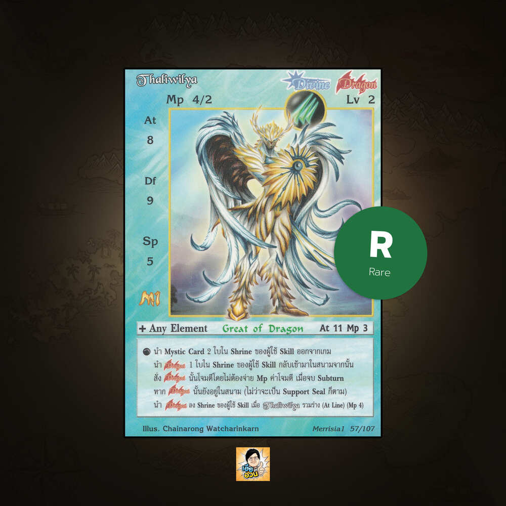 เป็นการ์ดเกม “Summoner Master OG” ในชุด “Merrisia 1st Impression” นี้จะมีการ์ดทั้งหมด 108 แบบ “Red Mane Therion” เป็น Seal Card ธาตุ Wind เผ่าพันธุ์ Divine Dragon หมายเลข 57 ระดับการค้นหา Rare-