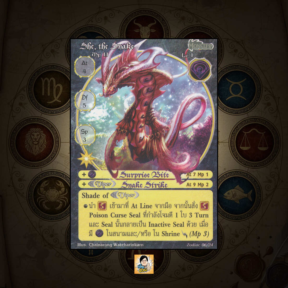 เป็นการ์ดเกม “Summoner Master OG” ในชุด “Zodiac” นี้จะมีการ์ดทั้งหมด 24 แบบ “She, the Snake” เป็น Seal Card ธาตุ Dark เผ่าพันธุ์ Monster หมายเลข 6 ระดับการค้นหา Special
