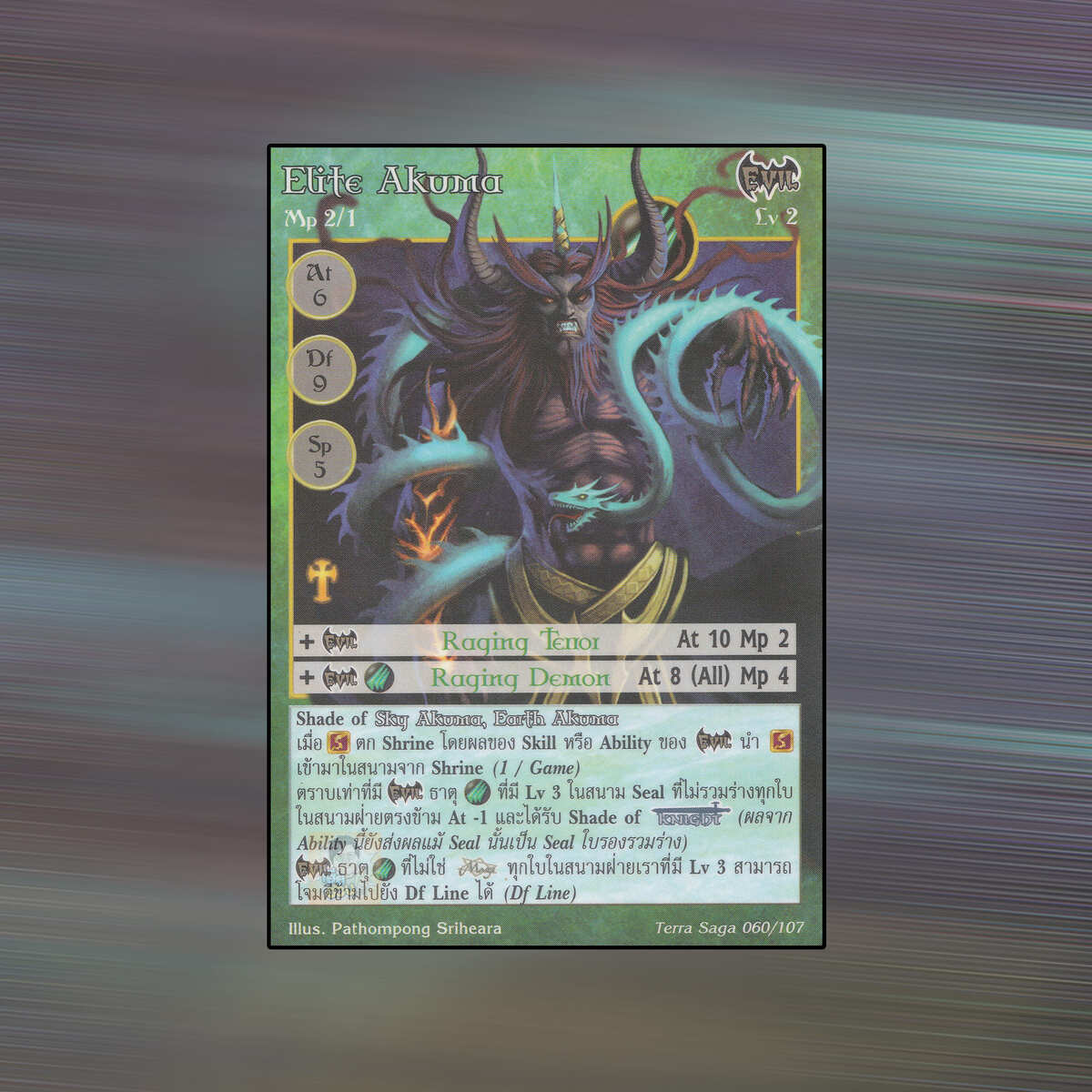 เป็นการ์ดเกม Summoner Master OG ในชุด Terra Saga นี้จะมีการ์ดทั้งหมด 108 แบบ Elite Akuma เป็น Seal Card ธาตุ Wind เผ่าพันธุ์ Evil หมายเลข 60 ระดับการค้นหา Rare