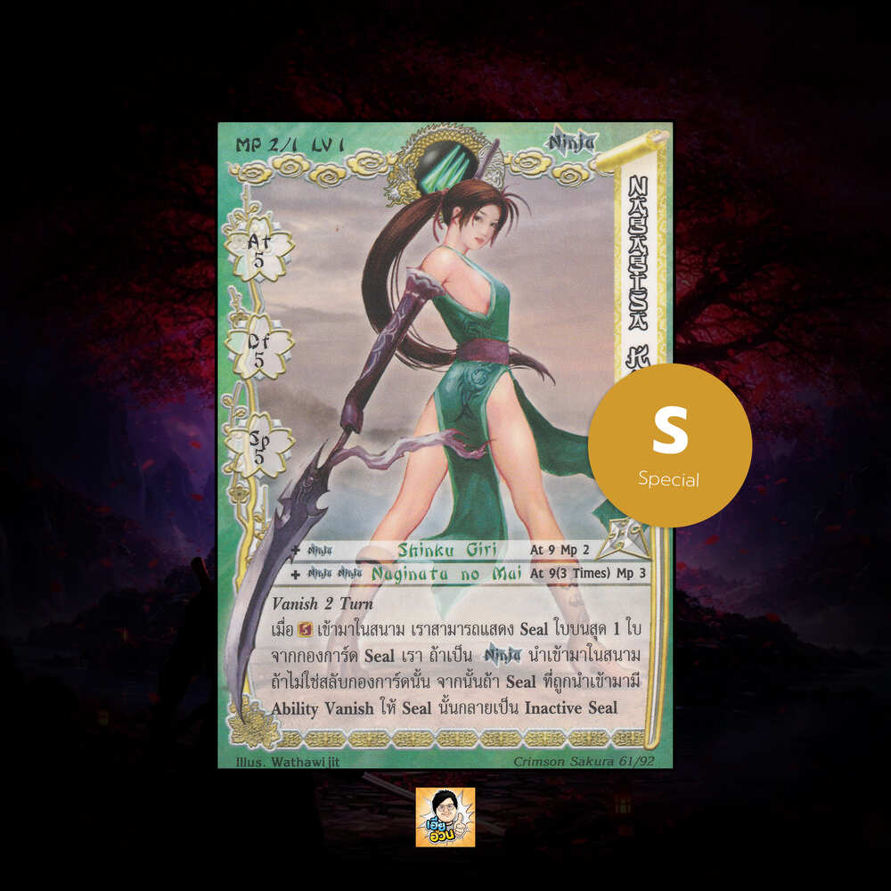 เป็นการ์ดเกม “Summoner Master OG” ในชุด “Crimson Sakura” นี้จะมีการ์ดทั้งหมด 93 แบบ “Nagagisa Kunoichi” เป็น Seal Card ธาตุ Wind ประเภท Ninja หมายเลข 61 ระดับการค้นหา Special