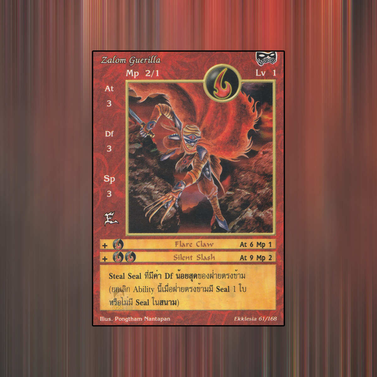 เป็นการ์ดเกม Summoner Master OG ในชุด Ekklesia นี้จะมีการ์ดทั้งหมด 168 แบบ Zalom Guerilla เป็น Seal Card ธาตุ Fire เผ่าพันธุ์ Bandit หมายเลข 61 ระดับการค้นหา Common