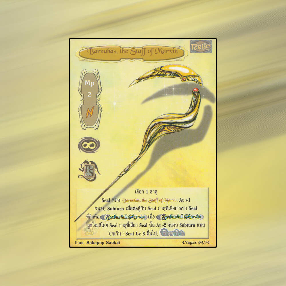 เป็นการ์ดเกม Summoner Master OG ในชุด 4 Nagas นี้จะมีการ์ดทั้งหมด 75 แบบ “Barnabas, the Staff of Marvin” เป็น Mystic Card หมายเลข 64 ประเภทสิ่งศักดิ์สิทธิ์ ระดับการค้นหาเป็นการ์ดพิเศษ
