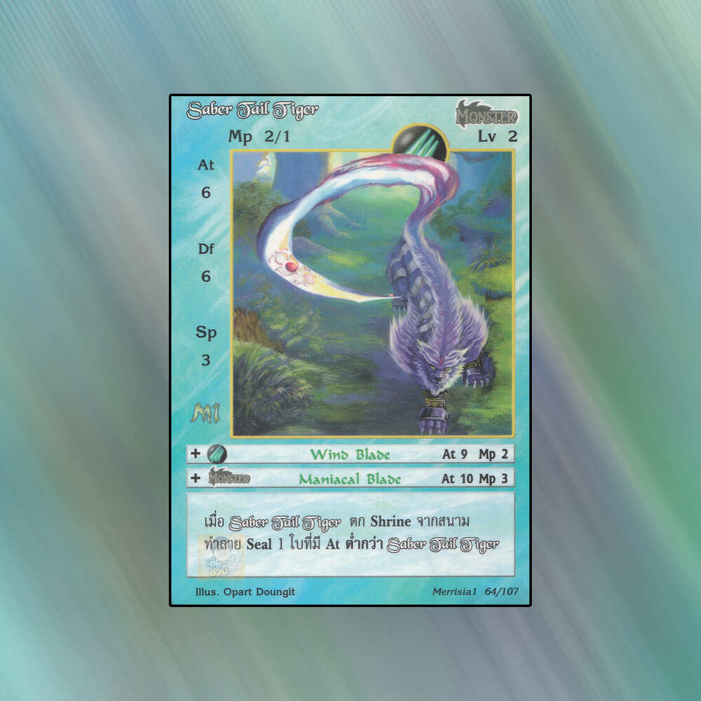 เป็นการ์ดเกม Summoner Master OG ในชุด Merrisia 1st Impression นี้จะมีการ์ดทั้งหมด 108 แบบ Saber Tail Tiger เป็น Seal Card ธาตุลม เผ่าสัตว์ประหลาด หมายเลข 64: ระดับการค้นหาเป็นการ์ดทั่วไป