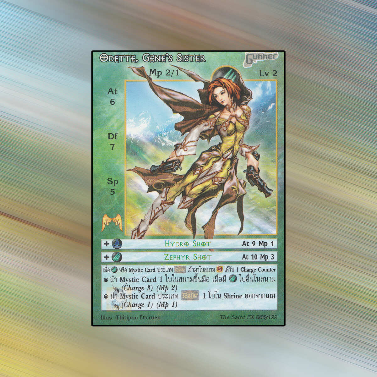 เป็นการ์ดเกม Summoner Master OG ในชุด The Saint EX นี้จะมีการ์ดทั้งหมด 123 แบบ Odette, Gene’s Sister เป็น Seal Card ธาตุ Wind เผ่าพันธุ์ Gunner หมายเลข 66 ระดับการค้นหา Rare