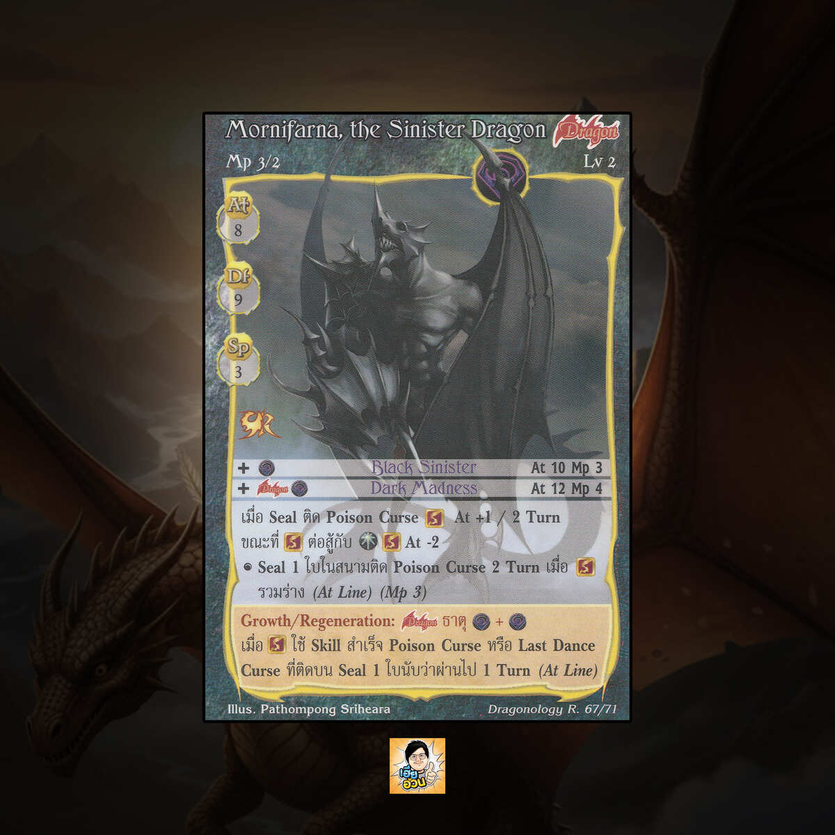 เป็นการ์ดเกม “Summoner Master OG” ในชุด “Dragonology Regeneration” นี้จะมีการ์ดทั้งหมด 72 แบบ “Mornifarna, the Sinister Dragon” เป็น Seal Card ธาตุ Dark ประเภท Dragon หมายเลข 67 ระดับการค้นหา Special