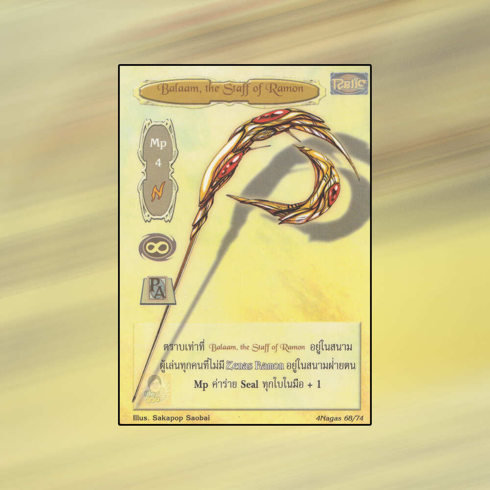 เป็นการ์ดเกม Summoner Master OG ในชุด 4 Nagas นี้จะมีการ์ดทั้งหมด 75 แบบ “Balaam, the Staff of Ramon” เป็น Mystic Card หมายเลข 68 ประเภทสิ่งศักดิ์สิทธิ์ ระดับการค้นหาเป็นการ์ดพิเศษ