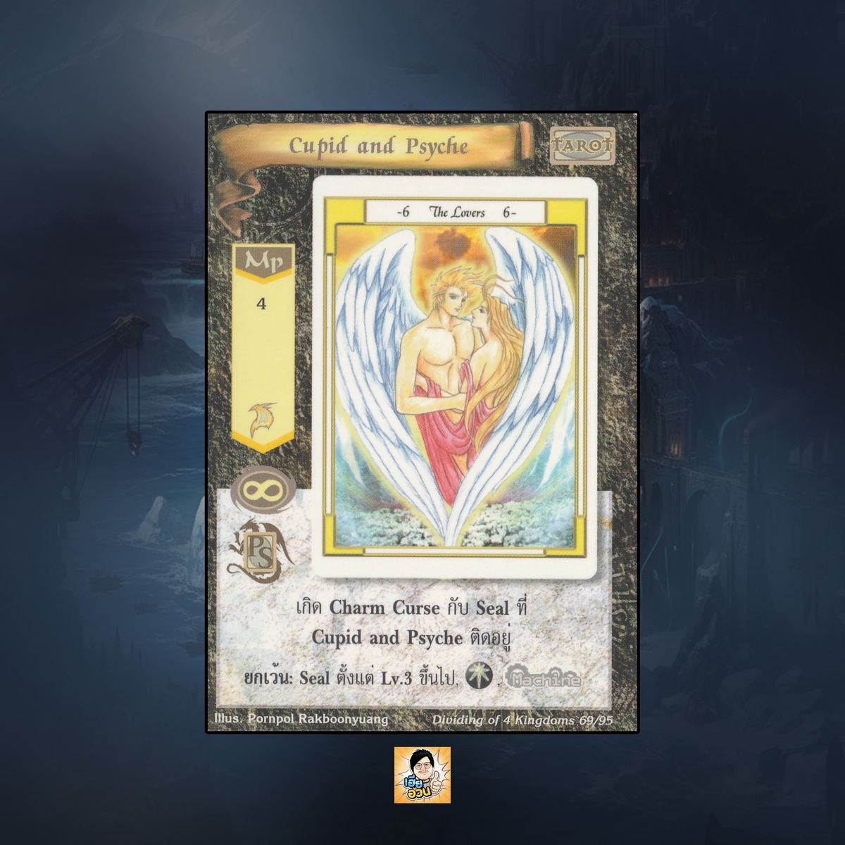 ในชุด “Dividing of 4 Kingdoms” นี้จะมีการ์ดทั้งหมด 95 ใบ “Cupid and Psyche” เป็น Mystic Cards หมายเลข 69 ประเภทไพ่ทาโรต์: ระดับการค้นหาเป็นการ์ดหายาก