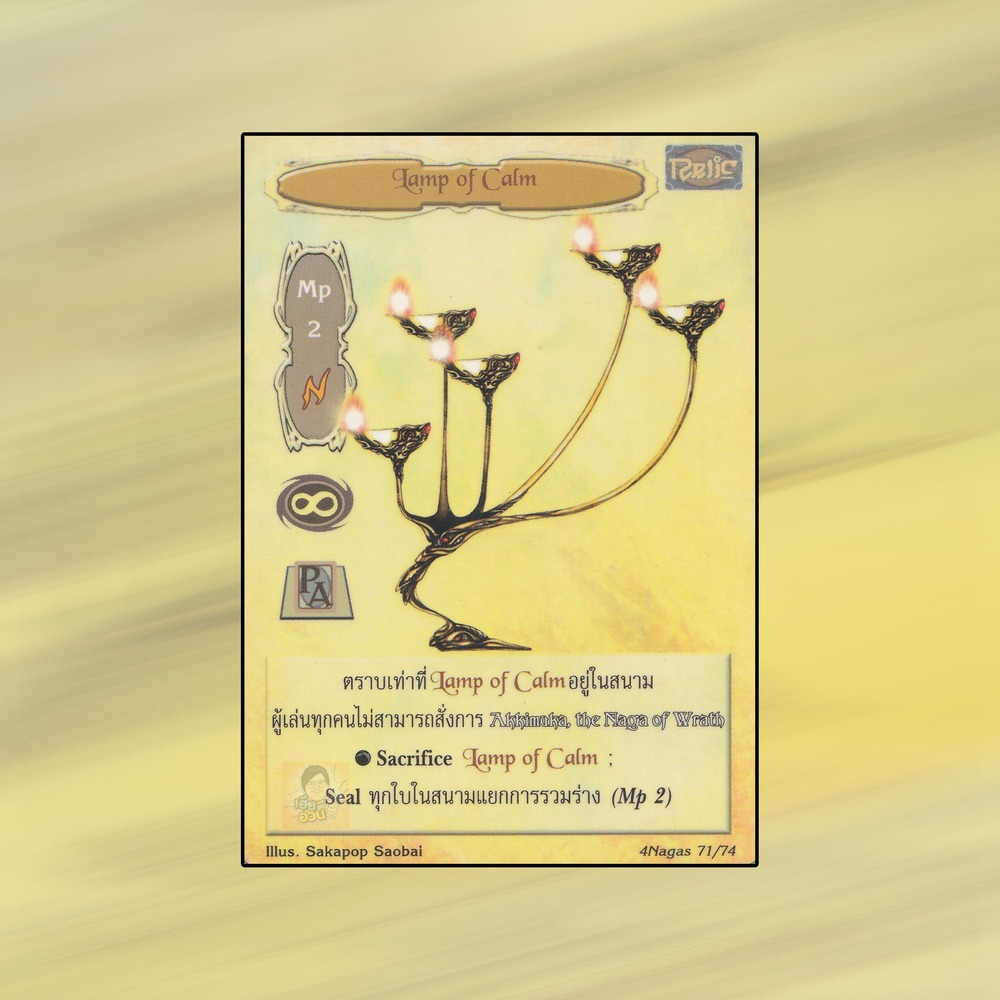 เป็นการ์ดเกม Summoner Master OG ในชุด 4 Nagas นี้จะมีการ์ดทั้งหมด 75 แบบ “Lamp of Calm” เป็น Mystic Card หมายเลข 71 ประเภทสิ่งศักดิ์สิทธิ์ ระดับการค้นหาเป็นการ์ดพิเศษ