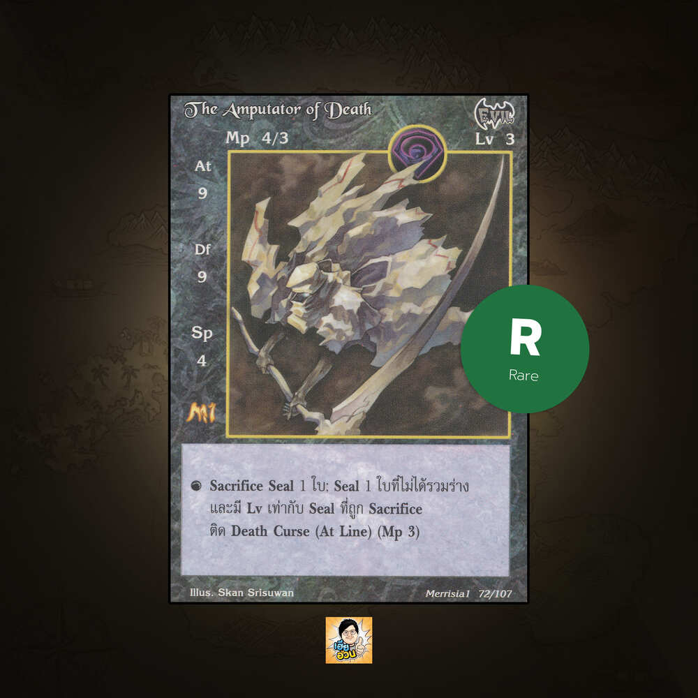 เป็นการ์ดเกม “Summoner Master OG” ในชุด “Merrisia 1st Impression” นี้จะมีการ์ดทั้งหมด 108 แบบ “The Amputator of Death” เป็น Seal Card ธาตุ Dark เผ่าพันธุ์ Evil หมายเลข 72 ระดับการค้นหา Rare-