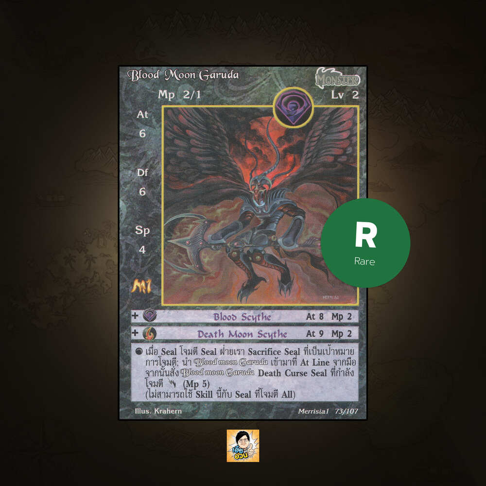 เป็นการ์ดเกม “Summoner Master OG” ในชุด “Merrisia 1st Impression” นี้จะมีการ์ดทั้งหมด 108 แบบ “Blood Moon Garuda” เป็น Seal Card ธาตุ Dark เผ่าพันธุ์ Monster หมายเลข 73 ระดับการค้นหา Rare-