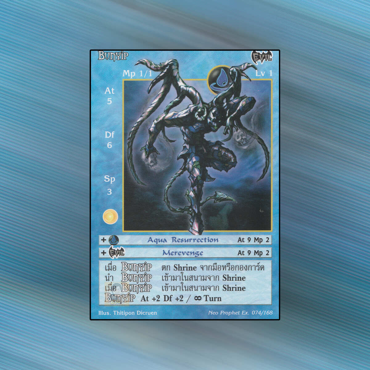 เป็นการ์ดเกม Summoner Master OG ในชุด Neo Prophet Extended นี้จะมีการ์ดทั้งหมด 169 แบบ “Bunyip” เป็น Seal Card ธาตุ Water เผ่าพันธุ์ Evil หมายเลข 74 ระดับการค้นหา Rare
