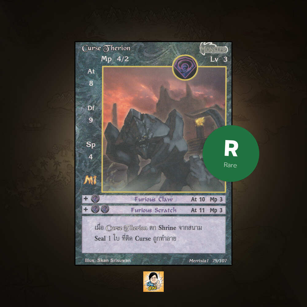 เป็นการ์ดเกม “Summoner Master OG” ในชุด “Merrisia 1st Impression” นี้จะมีการ์ดทั้งหมด 108 แบบ “Curse Therion” เป็น Seal Card ธาตุ Dark เผ่าพันธุ์ Monster หมายเลข 75 ระดับการค้นหา Rare