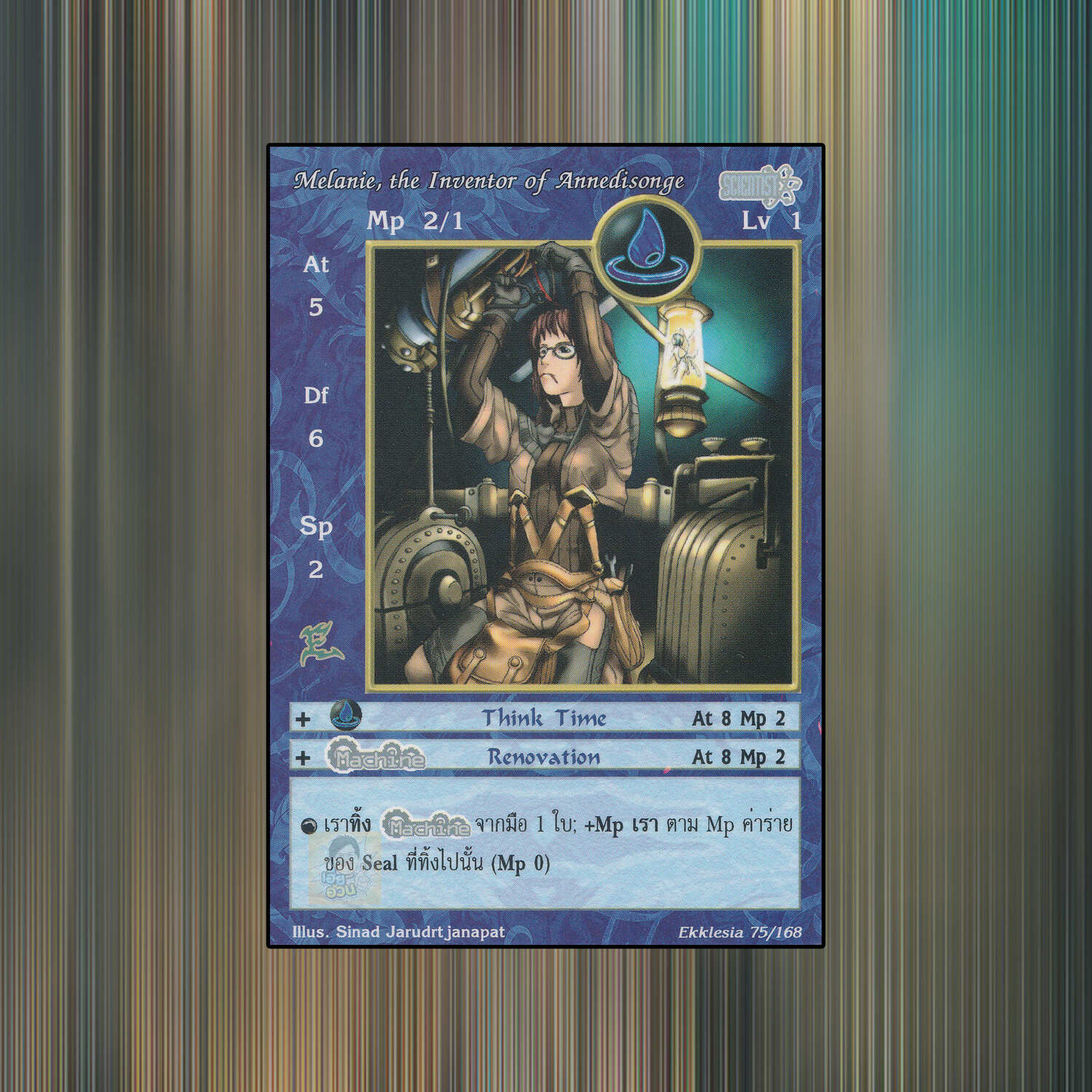 เป็นการ์ดเกม Summoner Master OG ในชุด Ekklesia นี้จะมีการ์ดทั้งหมด 168 แบบ Melanie, the Inventor of Annedisonge เป็น Seal Card ธาตุ Water เผ่าพันธุ์ Scientist หมายเลข 75 ระดับการค้นหา Uncommon