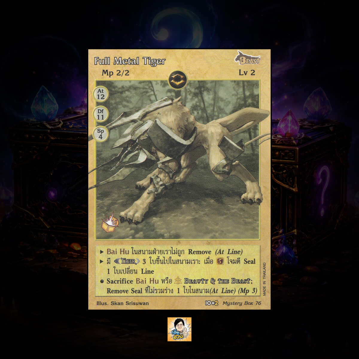 เป็นการ์ดเกม “Summoner Master OG” ในชุด “Mystery Box” นี้จะมีการ์ดทั้งหมด 131 แบบ “Full Metal Tiger” เป็น Seal Card ธาตุ Earth ประเภท Beast หมายเลข 76 ระดับการค้นหา Special