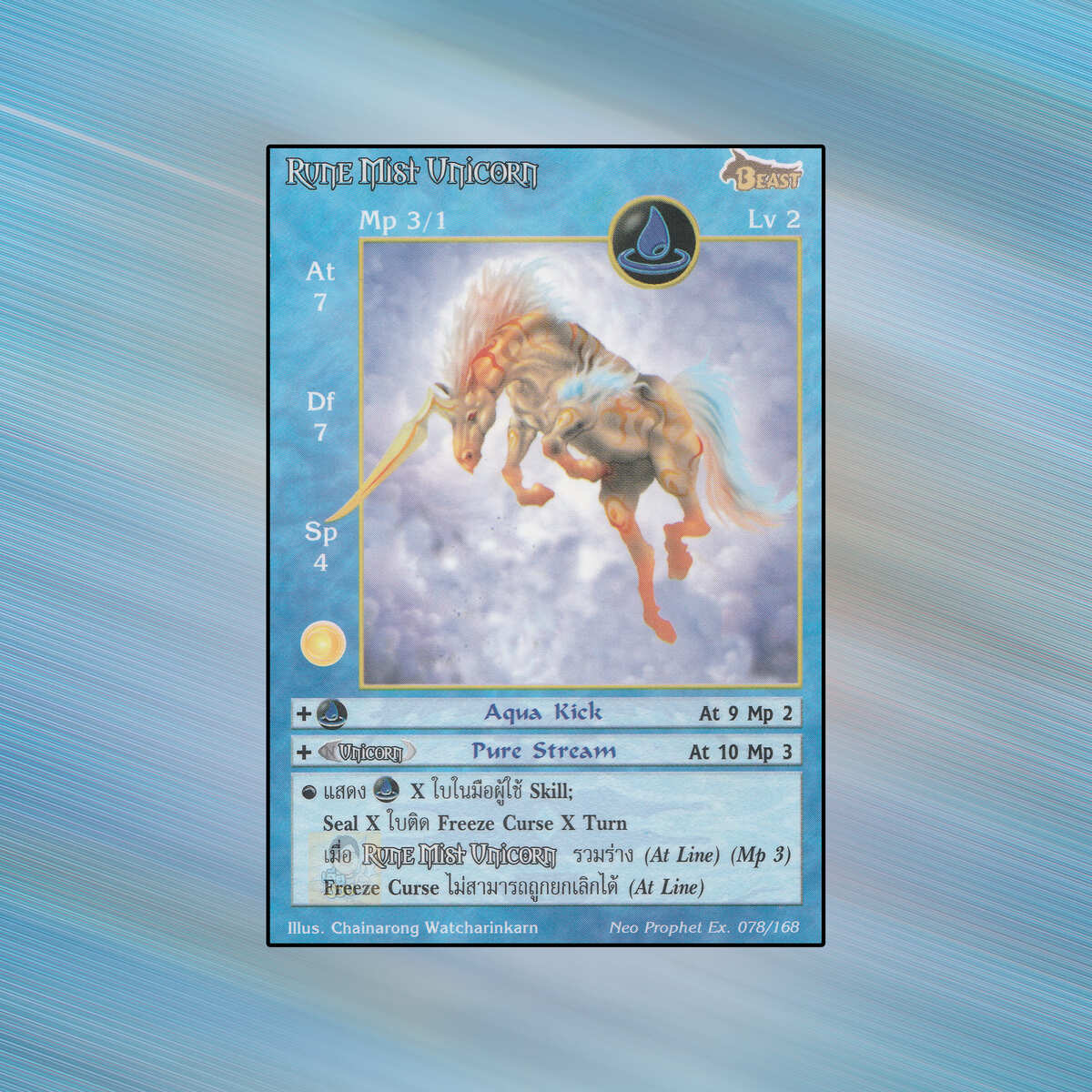 Rune Mist Unicorn เป็นการ์ดเกม Summoner Master OG ชุด Neo Prophet Extended เป็น Seal Card ธาตุ Water เผ่าพันธุ์ Beast หมายเลข 78 ระดับการค้นหา Rare