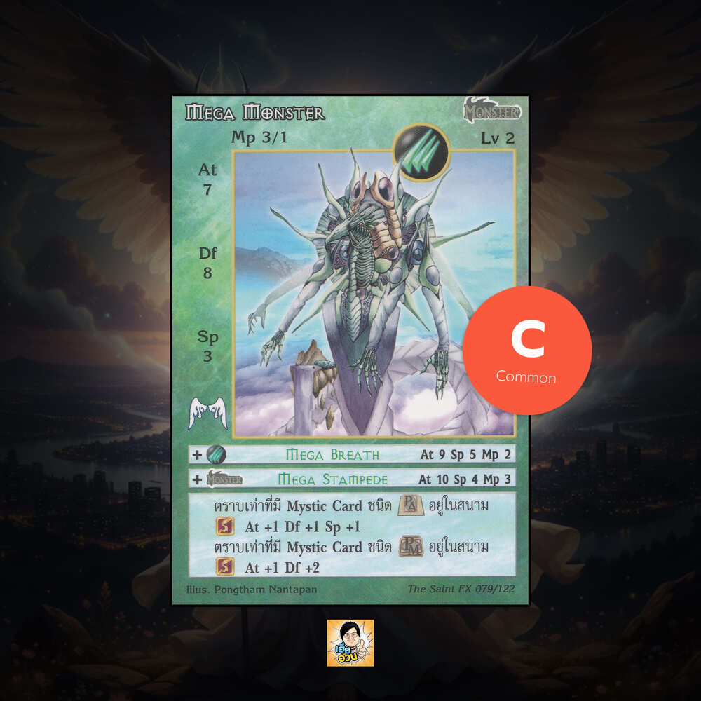 เป็นการ์ดเกม “Summoner Master OG” ในชุด “The Saint EX” นี้จะมีการ์ดทั้งหมด 123 แบบ “Mega Monster” เป็น Seal Card ธาตุ Wind เผ่าพันธุ์ Monster หมายเลข 79 ระดับการค้นหา Common