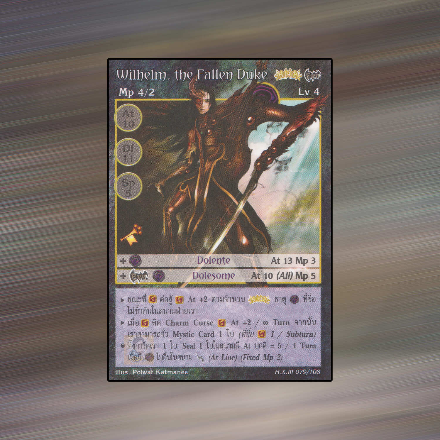Wilhelm, the Fallen Duke เป็นการ์ดเกม Summoner Master OG ชุด Hymn of Exodus III เป็น Seal Cards หมายเลข 79 เลเวล 4 ธาตุมืด เผ่าพันธุ์บทเพลงอธรรม ระดับการค้นหาเป็นการ์ดหายาก