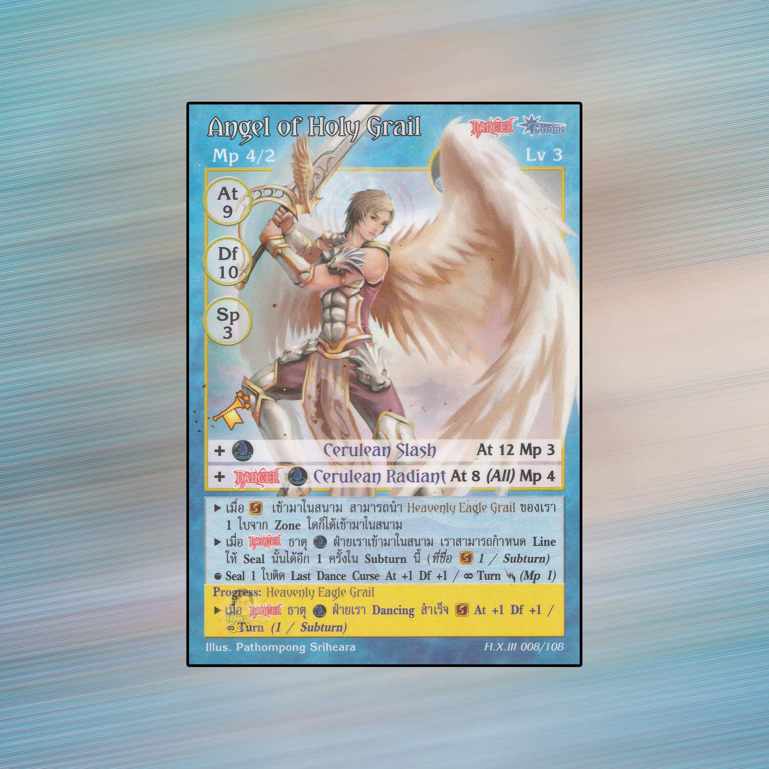 เป็นการ์ดเกม Summoner Master OG ในชุด Hymn of Exodus III นี้จะมีการ์ดทั้งหมด 126 แบบ Angel of Holy Grail เป็น Seal Card ธาตุน้ำ เผ่าพันธุ์นักเต้นรำศักดิ์สิทธิ์ หมายเลข 8 ระดับการค้นหาเป็นการ์ดหายาก