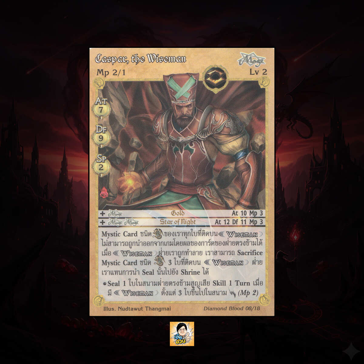 เป็นการ์ดเกม “Summoner Master OG” ในชุด “DIAMOND BLOOD” นี้จะมีการ์ดทั้งหมด 18 แบบ “Caspar, the Wiseman” เป็น Seal Card ธาตุ Earth เผ่าพันธุ์ Mage หมายเลข 8 ระดับการค้นหา Special