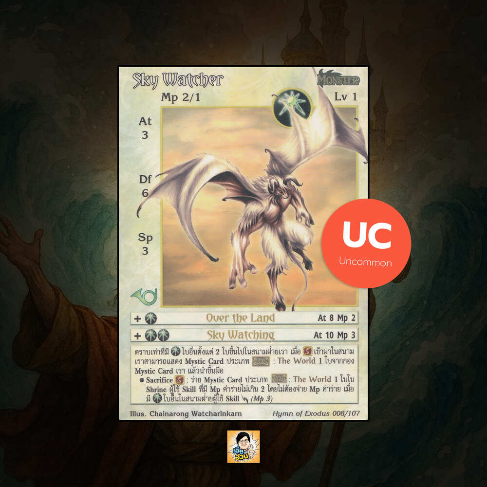 เป็นการ์ดเกม “Summoner Master OG” ในชุด “Hymn of Exodus” นี้จะมีการ์ดทั้งหมด 108 แบบ “Sky Watcher” เป็น Seal Card ธาตุ Light เผ่าพันธุ์ Monster หมายเลข 8 ระดับการค้นหา Uncommon
