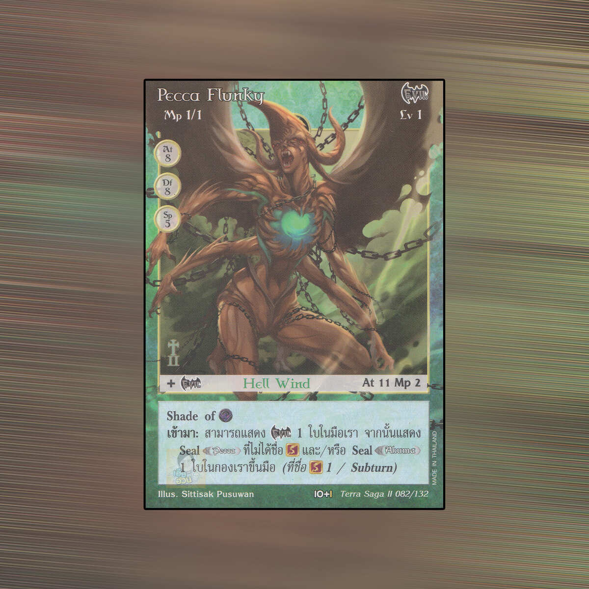 เป็นการ์ดเกม Summoner Master OG ในชุด Terra Saga II นี้จะมีการ์ดทั้งหมด 132 แบบ Pecca Flunky เป็น Seal Card ธาตุ Wind เผ่าพันธุ์ Evil หมายเลข 82 ระดับการค้นหา Uncommon