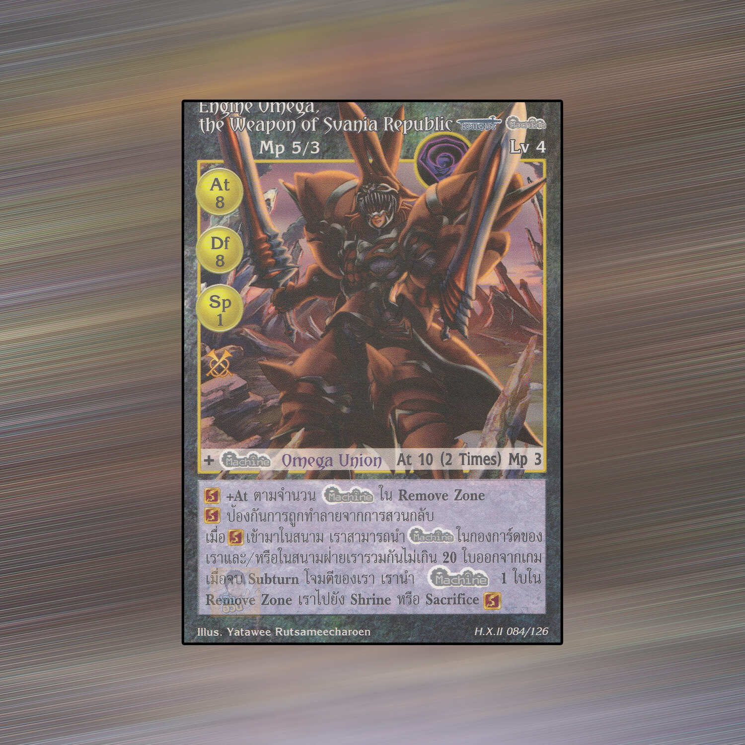 เป็นการ์ดเกม Summoner Master OG ในชุด Hymn of Exodus II นี้จะมีการ์ดทั้งหมด 138 แบบ Engine Omega, the Weapon of Svania Republic เป็น Seal Card ธาตุมืด เผ่าพันธุ์อัศวินจักรกล หมายเลข 84 ระดับการค้นหาเป็นการ์ดหายาก