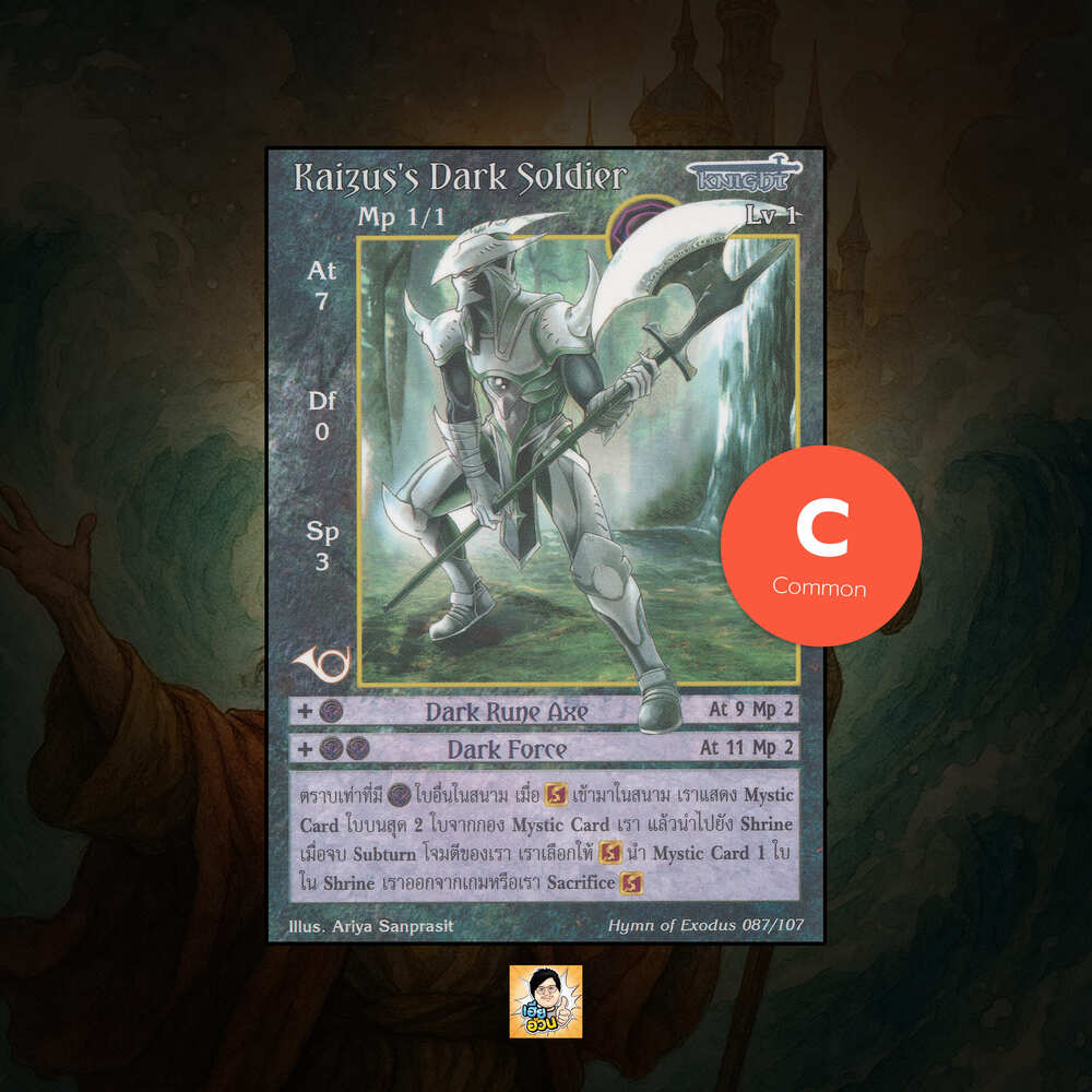 ป็นการ์ดเกม “Summoner Master OG” ในชุด “Hymn of Exodus” นี้จะมีการ์ดทั้งหมด 108 แบบ “Kaizus’s Dark Soldier” เป็น Seal Card ธาตุ Dark เผ่าพันธุ์ Knight หมายเลข 87 ระดับการค้นหา Common