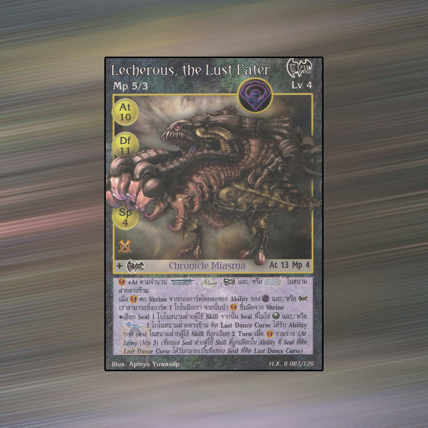 เป็นการ์ดเกม Summoner Master OG ในชุด Hymn of Exodus II นี้จะมีการ์ดทั้งหมด 138 แบบ Lecherous, the Lust Eater เป็น Seal Card ธาตุมืด เผ่าพันธุ์ปีศาจ หมายเลข 87 ระดับการค้นหาเป็นการ์ดหายาก