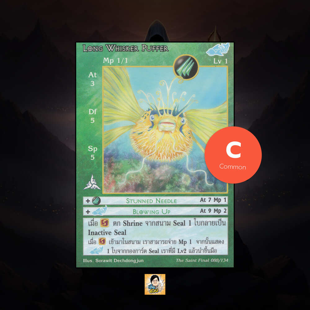 เป็นการ์ดเกม “Summoner Master OG” ในชุด “The Saint Final” นี้จะมีการ์ดทั้งหมด 135 แบบ “Long Whisker Puffer” เป็น Seal Card ธาตุ Wind เผ่าพันธุ์ Fish หมายเลข 88 ระดับการค้นหา Common