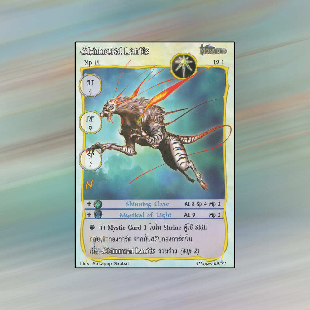 เป็นการ์ดเกม Summoner Master OG ในชุด 4 Nagas นี้จะมีการ์ดทั้งหมด 75 แบบ “Shimmeral Lantis” เป็น Seal Card ธาตุแสง เผ่าสัตว์ประหลาด หมายเลข 9: ระดับการค้นหาเป็นการ์ดพิเศษ-