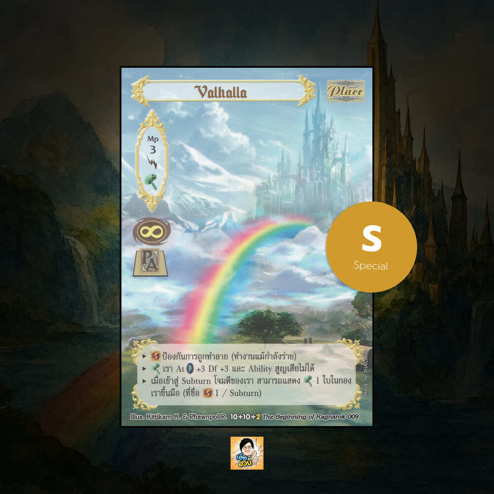 เป็นการ์ดเกม “Summoner Master OG” ในชุด “The Beginning of Ragnarok” นี้จะมีการ์ดทั้งหมด 12 แบบ “Valhalla” เป็น Mystic Card ประเภท Place หมายเลข 9 ระดับการค้นหา Special