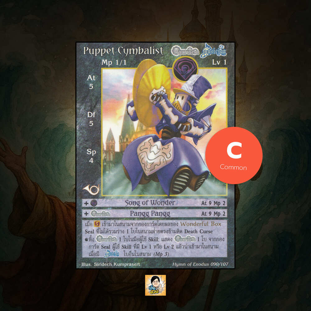 ป็นการ์ดเกม “Summoner Master OG” ในชุด “Hymn of Exodus” นี้จะมีการ์ดทั้งหมด 108 แบบ “Puppet Cymbalist” เป็น Seal Card ธาตุ Dark เผ่าพันธุ์ Machine Musician หมายเลข 90 ระดับการค้นหา Common