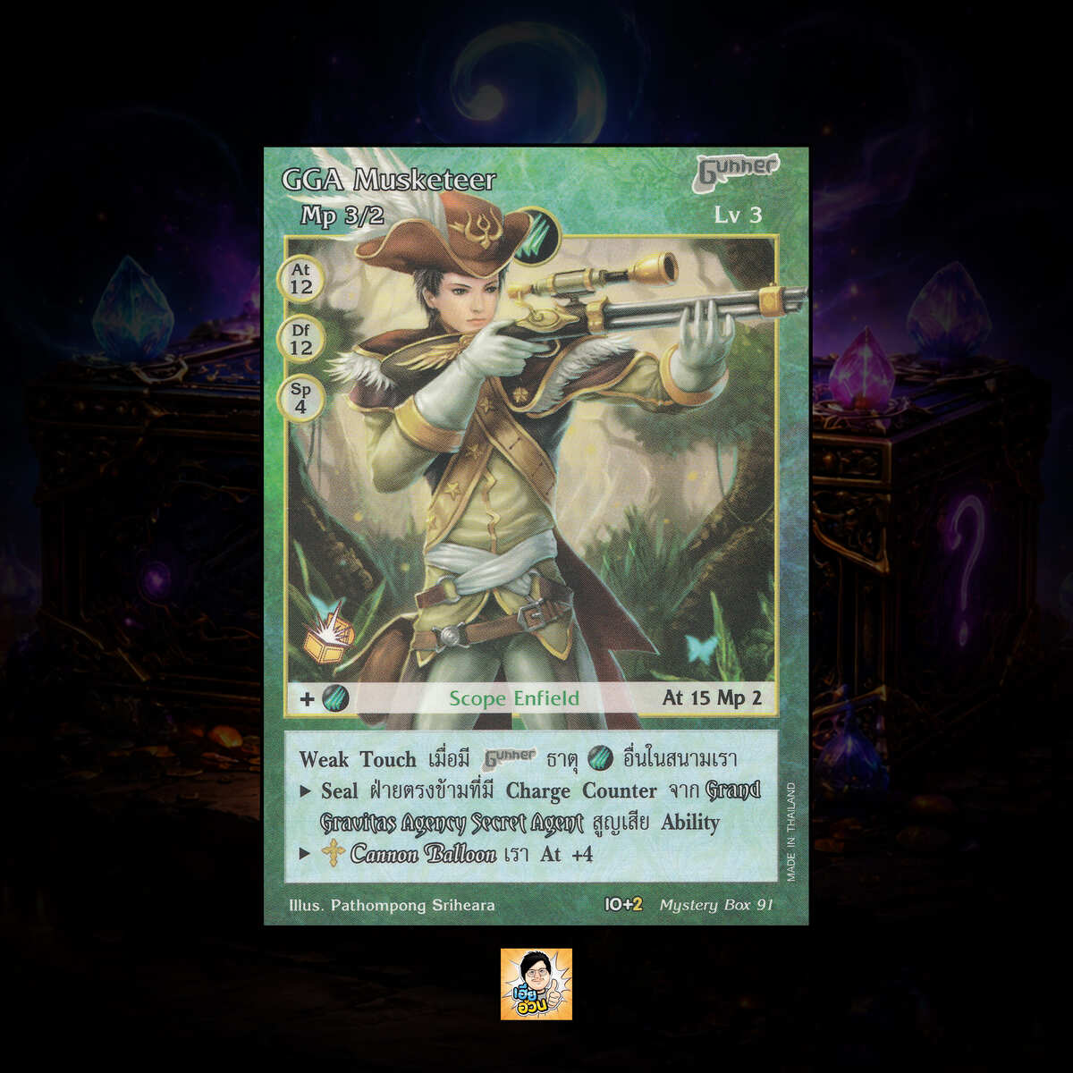เป็นการ์ดเกม “Summoner Master OG” ในชุด “Mystery Box” นี้จะมีการ์ดทั้งหมด 131 แบบ “GGA Musketeer” เป็น Seal Card ธาตุ Wind ประเภท Gunner หมายเลข 91 ระดับการค้นหา Special